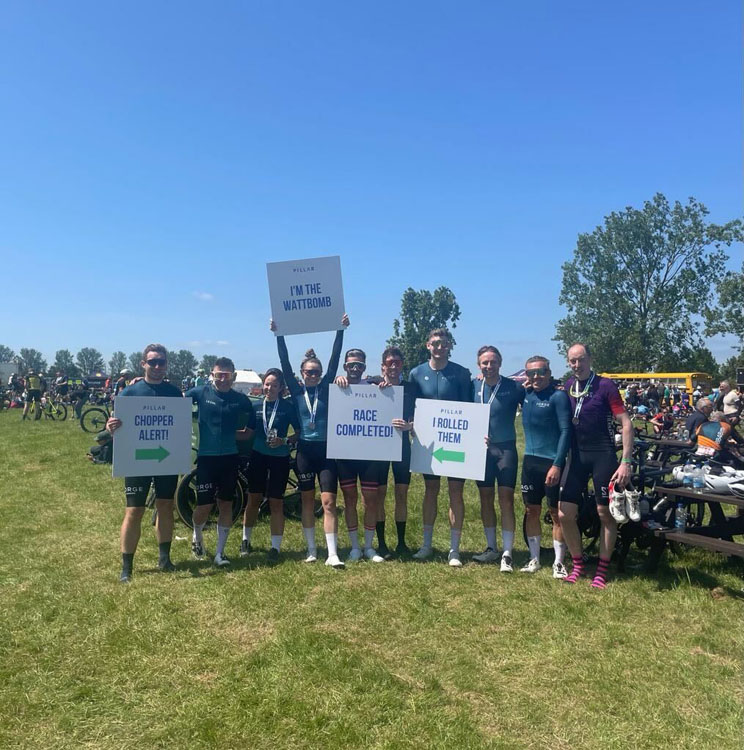 First to set off at 9am were Lewis C, ToBo, Ben D and Byron K, in the 19-34-year-old whipper-snapper group. They set a blistering average speed of 45kmph. There were attacks from the off, with last year’s winner, backed by a strong team, attacking from kilometre one. Our boys managed to hold their own and the first hour was a succession of attacks, and energy-sapping sprints out of tight turns.